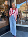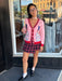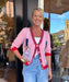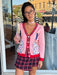 Add a playful pop to your wardrobe with this champagne-inspired cardigan. Designed in a soft blush pink knit, it features sparkling sequin champagne bottle motifs on each side, complete with bow accents for a feminine touch. Bold red trim with contrast stripes and pearl-style buttons give it a chic, standout finish. Perfect for layering over a simple tee or tank, this cardigan effortlessly blends fun and sophistication—ideal for brunch, parties, or adding a little celebration to your everyday style.
