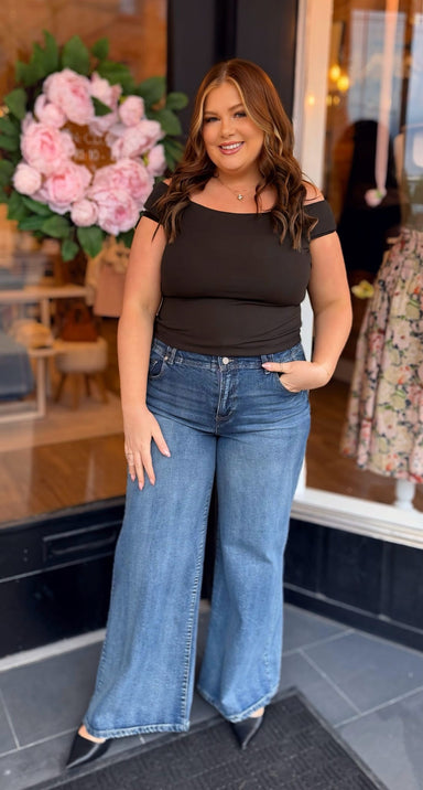 Grace of the Fiona wide leg jean in Fog Sky wash. These high-rise beauties feature a chic cut-off hem, infusing modern flair into a timeless silhou...