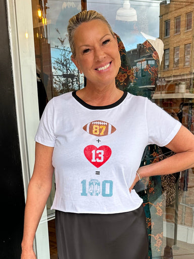 A playful nod to football and love, this graphic tee brings sporty charm with a sweet twist. Featuring a bold football with the number 87, a heart ...