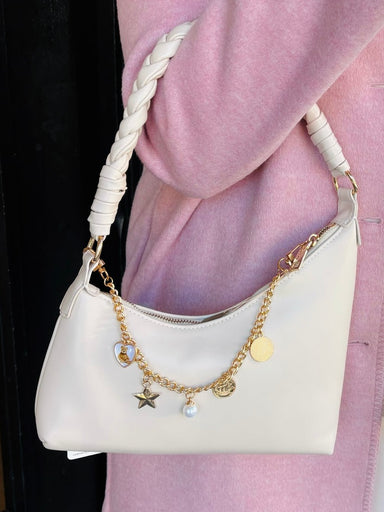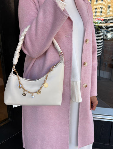A-symmetrical cream bag, perfect accessory to elevate any outfit. *Bag Charm sold separately!