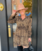 Turn heads in this effortlessly chic long-sleeve mini dress. Featuring a striking black and gold abstract print, this flowy silhouette drapes beautifully for a look that’s both relaxed and elevated. The button-front detail and subtle collar add a touch of polish, while the tiered hem brings playful movement with every step. Perfect with boots for a daytime look or dressed up with heels for a night out.