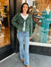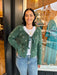 Cozy meets chic in this dreamy emerald green cardigan. Covered in soft, textured faux-fur fabric, it’s sprinkled with delicate crystal flower embellishments that catch the light just right. The deep V-neckline ties together with a satin ribbon bow, adding a touch of feminine charm and holiday sparkle.