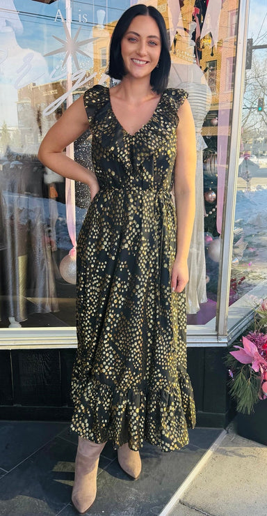 Meet your new statement dress for celebrations, nights out, and any moment you want to shine. This flowy black maxi is sprinkled with shimmering go...