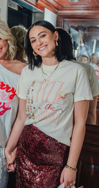 Serve major holiday cheer with a playful pop in our Fizz the Season Tee! This festive graphic top features a champagne-tower motif paired with whim...