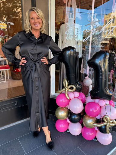 Step into timeless sophistication with our Satin Pleated Midi Dress, designed to make a lasting impression. This lustrous, deep gray dress features...