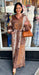 This statement top brings effortless style with a bold, artistic edge. Featuring a rich mix of earthy tones, it showcases a patchwork-inspired blend of paisley and floral prints that create a standout, one-of-a-kind look.
