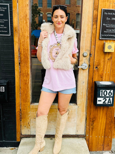 Add a layer with this gorgeous faux fur vest! We love her over a casual look and we love her styled all the way up!