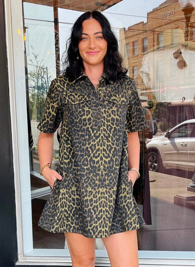Unleash your wild side with this fierce leopard-print mini dress. Designed with a structured collar, button-down front, and short sleeves, it offer...