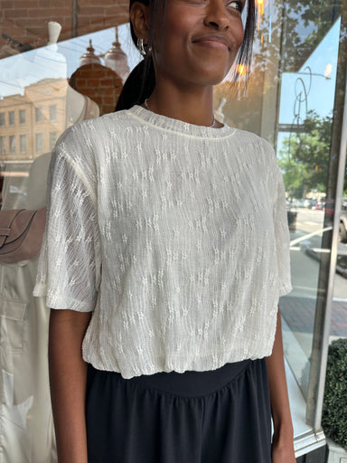 This textured knit top features a soft gauge open weave with a notched neckline, tonal patch detail, ribbed hem, and relaxed cap sleeves for an eff...