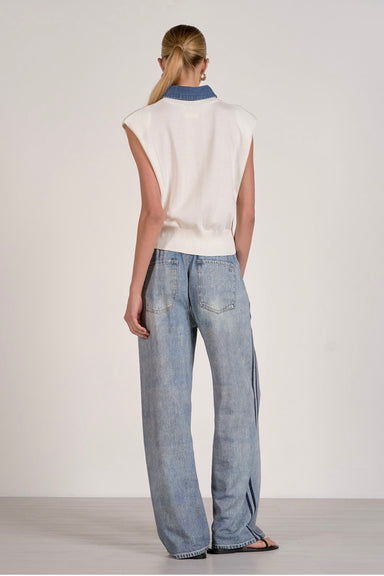 An easy upgrade to your everyday basics. This sleeveless knit top features a soft, sweater-like body with a contrast denim collar and partial butto...