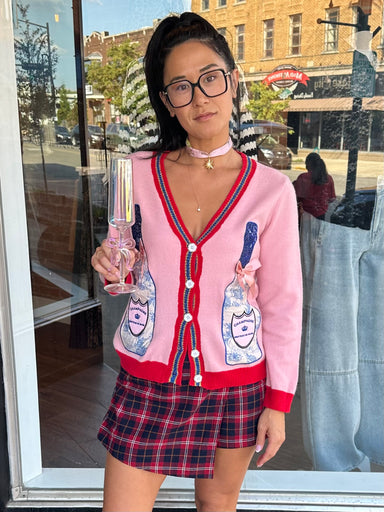 Add a playful pop to your wardrobe with this champagne-inspired cardigan. Designed in a soft blush pink knit, it features sparkling sequin champagn...