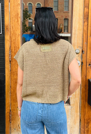 This textured knit top features a soft gauge open weave with a notched neckline, tonal patch detail, ribbed hem, and relaxed cap sleeves for an eff...