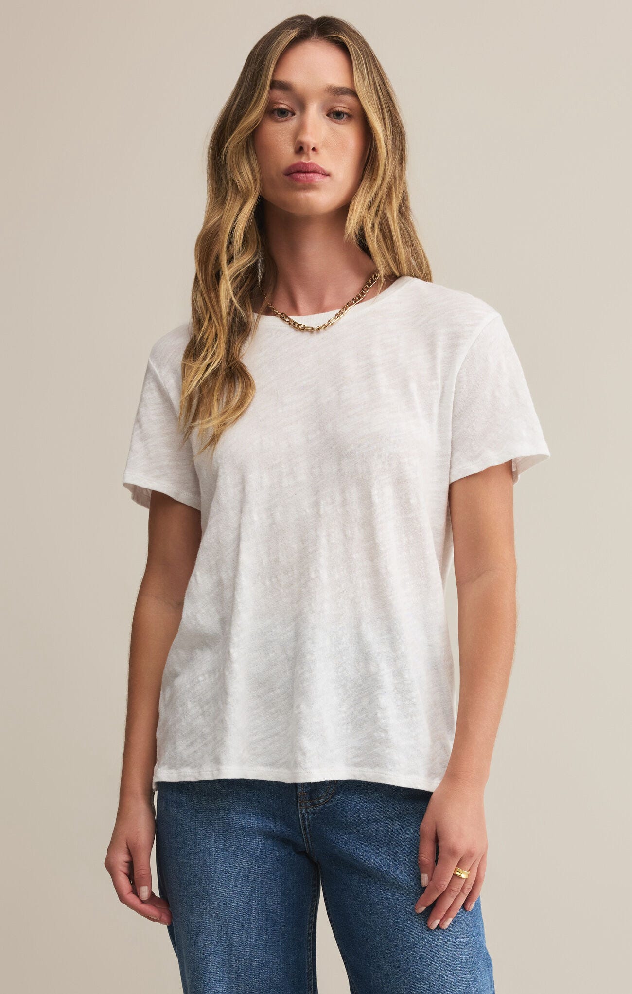 Effortless, breathable, and undeniably chic — The Foundation Slub Tee in white is the staple your wardrobe has been waiting for. Crafted from a lightweight linen blend, this tee features a subtly textured finish for a relaxed yet polished look. The classic crew neckline, short sleeves, and slightly relaxed fit make it versatile enough to dress up or down. Pair it with your favorite denim for a timeless casual outfit, or tuck it into tailored trousers for an elevated minimalist ensemble. Finished with a soft hand feel and natural drape, it’s the definition of easygoing elegance.