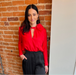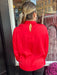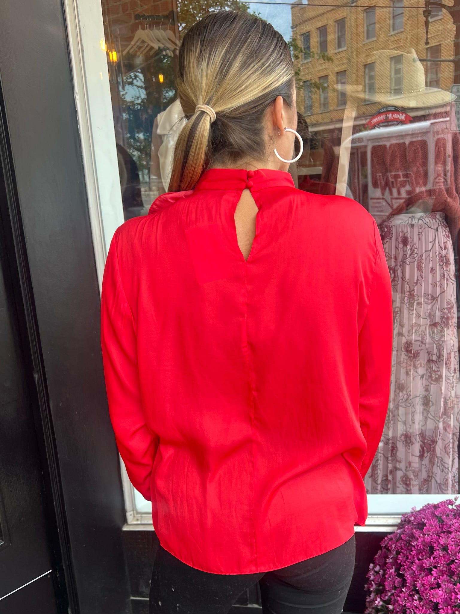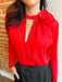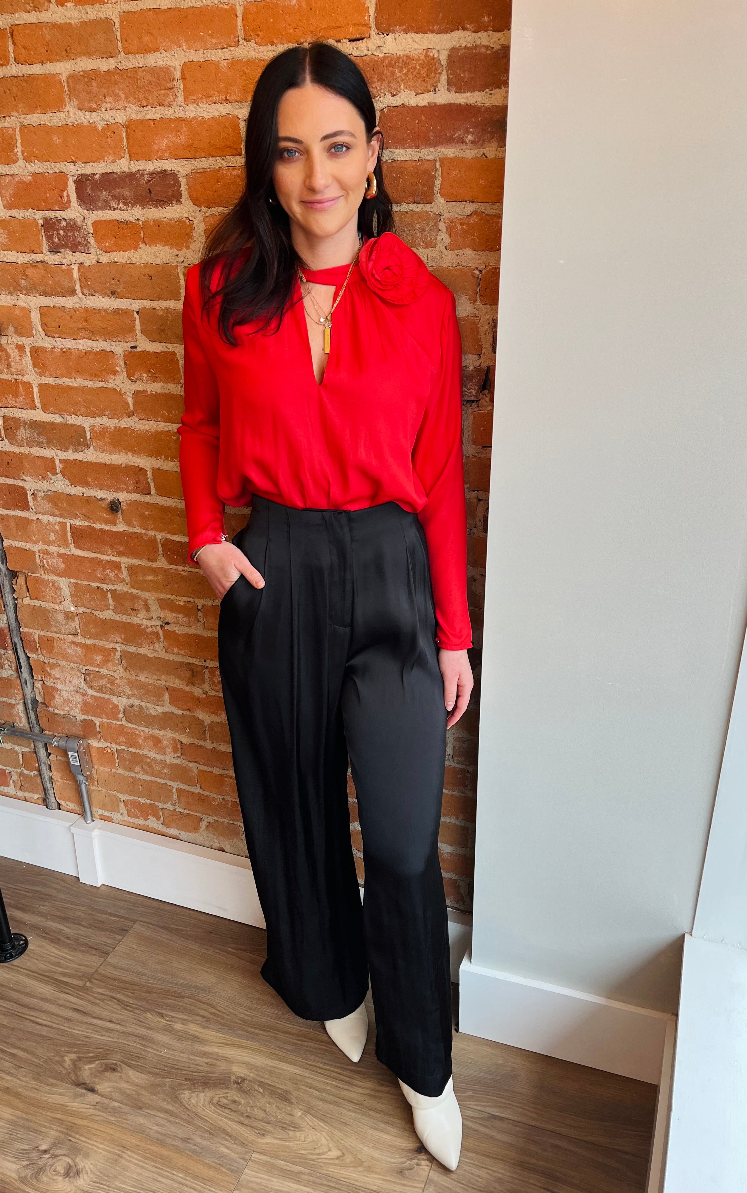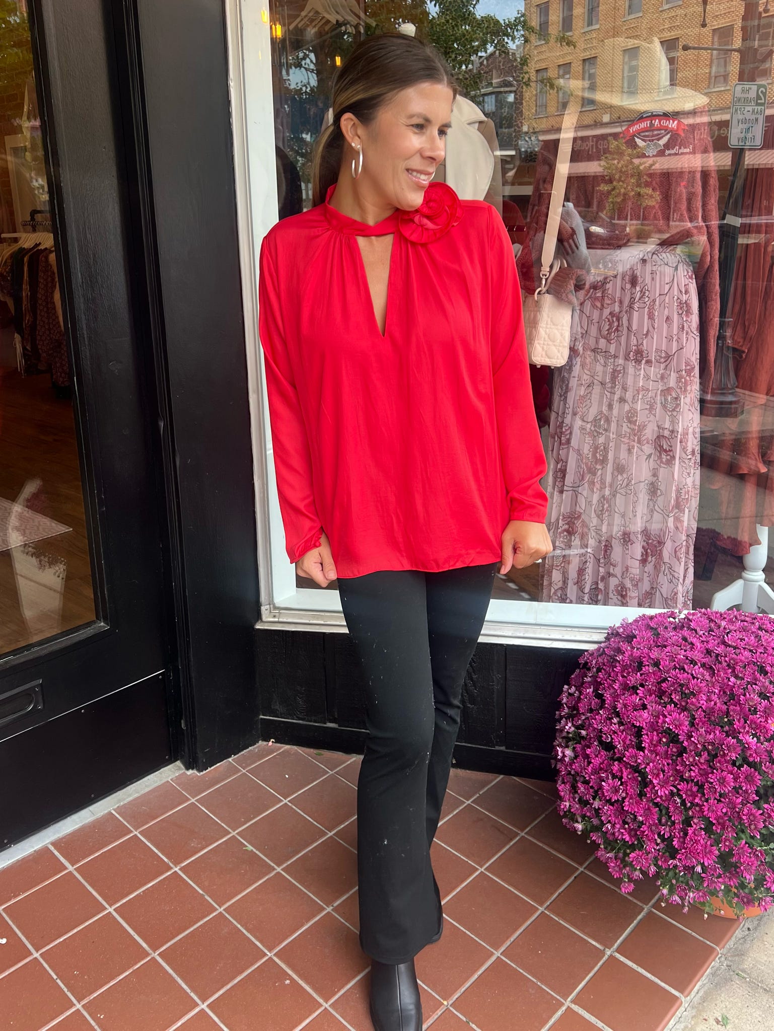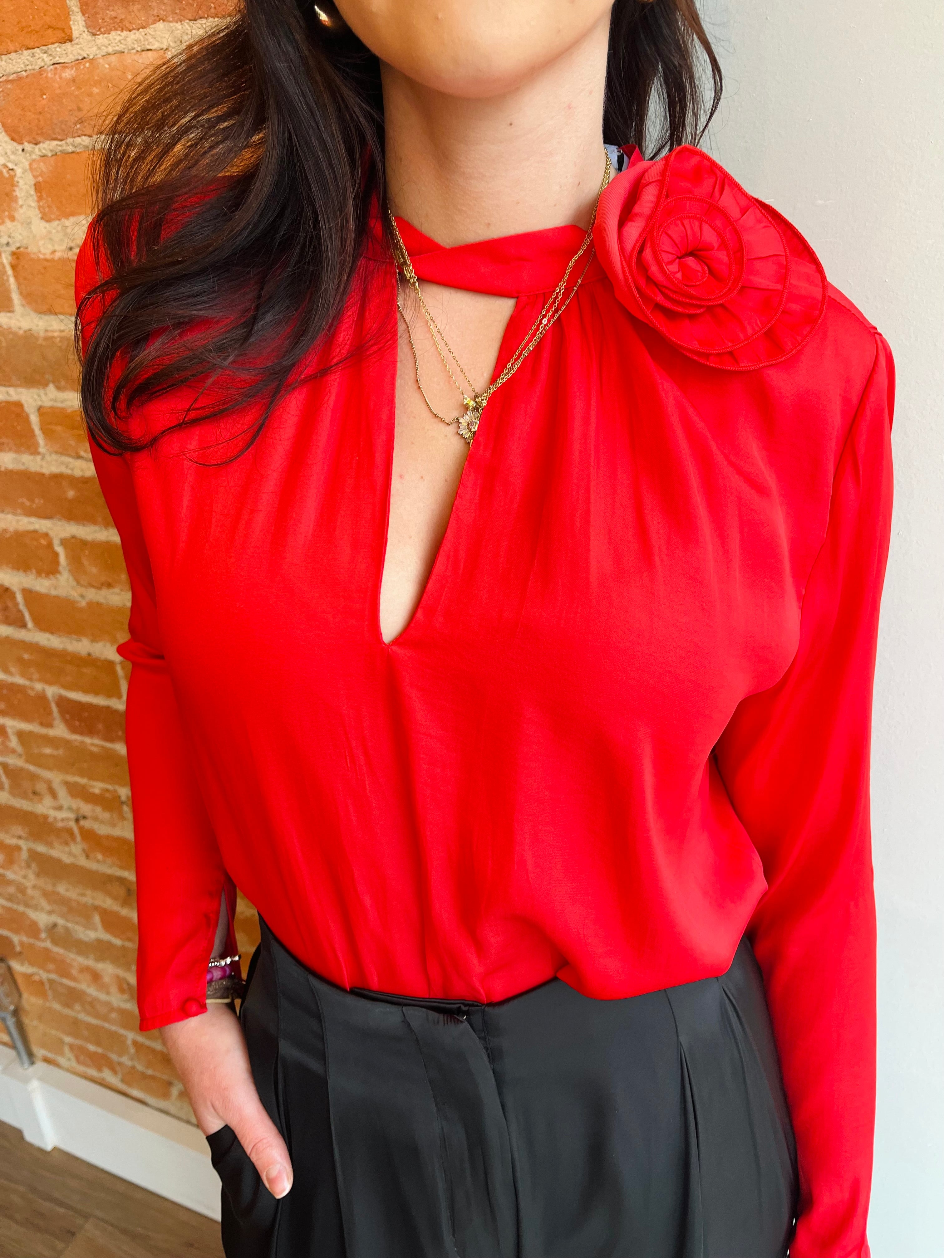 This vibrant red blouse is a statement piece designed to stand out with its striking details. The high neckline features a unique cutout, adding a touch of modern sophistication, while the standout feature is the oversized fabric flower embellishment on the shoulder, offering an elegant and artistic flair. The relaxed fit and lightweight fabric provide both comfort and style, making it perfect for a variety of occasions. With long sleeves finished with delicate button details, this top can be dressed up with tailored trousers or worn casually with jeans for a bold, chic look.