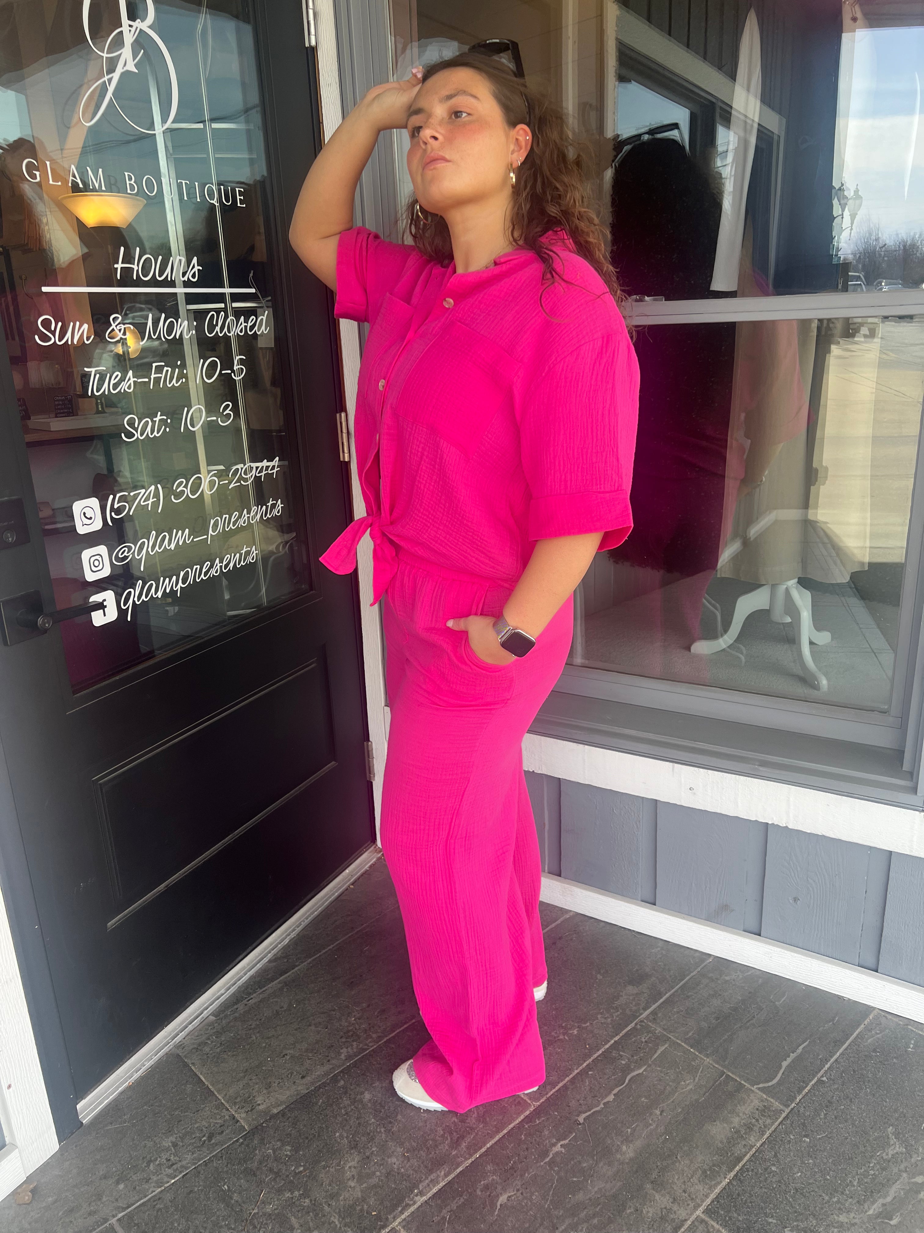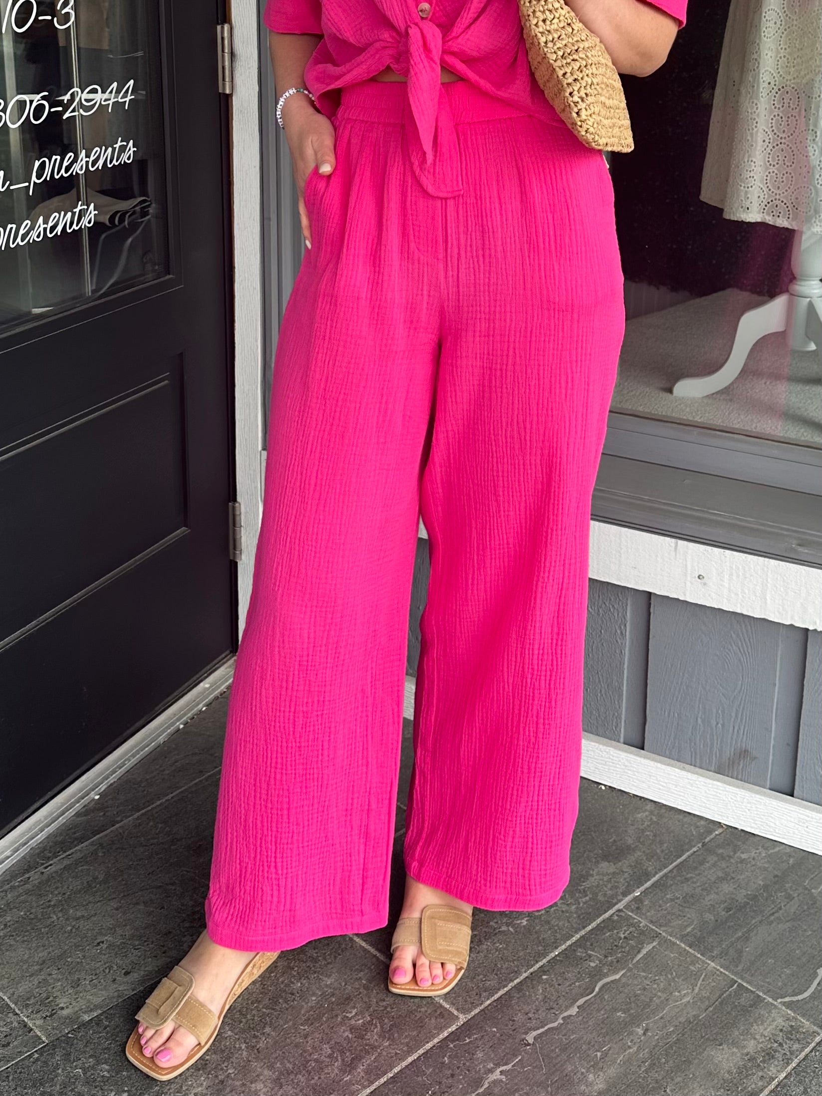 Beach days are calling our name with these cute hot pink pants and coordinating top in lightweight gauze!